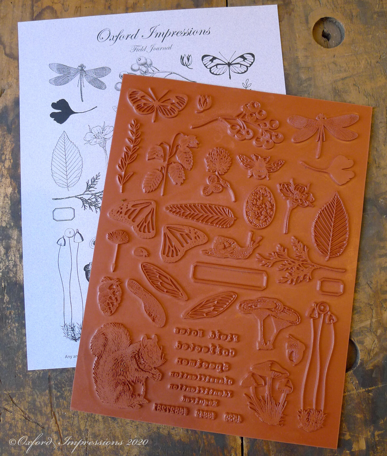 Oxford Impressions rubber stamps are sold unmounted and come as uncut sheets of traditional red rubber. The stamps are intended for use with temporary mounting systems such as cling foam, and Tack & Peel with acrylic blocks. They may also be permanently mounted to wood blocks.